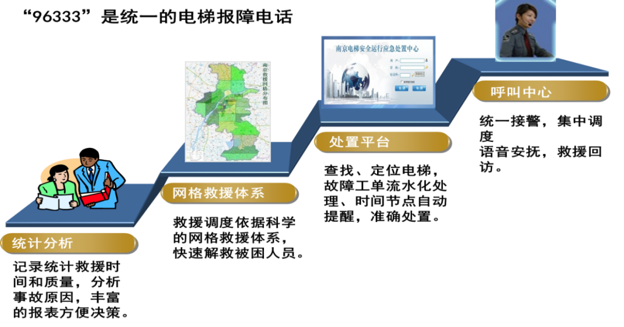 电梯应急处置平台以物联网技术、GIS和GPS技术、数字语音技术、SOA开发技术等为基础,以光纤和4G网络为数据传输通道,具备电梯网格救援、调度派单、呼叫中心、信息管理、决策分析等功能。