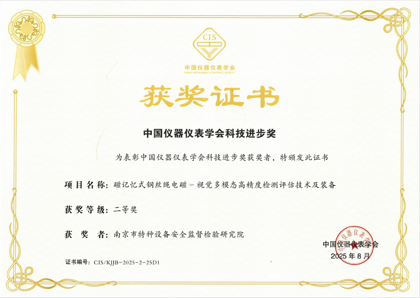 中国仪器仪表学会科学技术奖是经国家科技部批准,在国家科技奖励主管部门注册,由中国仪器仪表学会设立的面向全国仪器仪表领域的综合性奖项 ,自2001年设立后,其行业影响力和认可度不断提升,优秀获奖项目还可由学会提名国家科学技术奖。该奖主要面向精密仪器与测量、传感器技术、测量与自动控制技术等领域。其中,科技进步奖旨在表彰在应用推广先进科学技术成果、完成重大科学技术工程等方面做出突出贡献的个人和组织。2025年度中国仪器仪表学会科学技术奖共评选出一等奖21项,二等奖70项,三等奖21项 ,市特检院此次获奖,也是对其在钢丝绳/钢带检测技术领域创新成果的高度肯定。