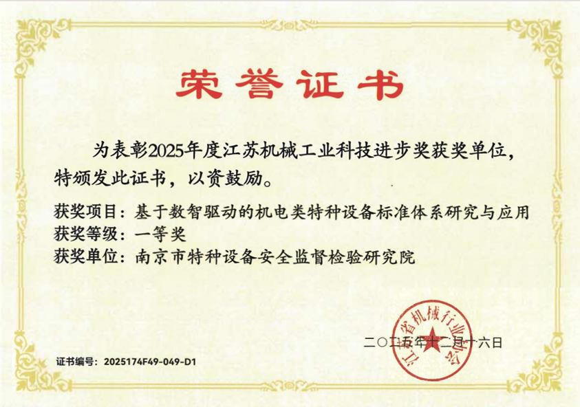 近日,由南京市特检院、省特检院与南京宁特安全科技有限公司联合申报的 “基于数智驱动的机电类特种设备标准体系研究与应用”项目,凭借突出的创新性、实用性与行业引领性,成功斩获江苏机械工业科技进步一等奖,为我省特种设备标准化建设树立行业标杆。