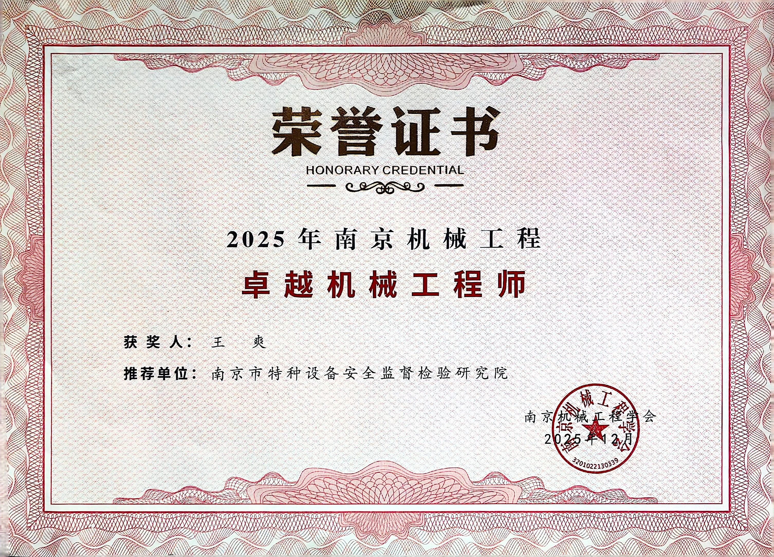 市特检院王爽同志荣获南京机械工程学会“卓越机械工程师奖”
