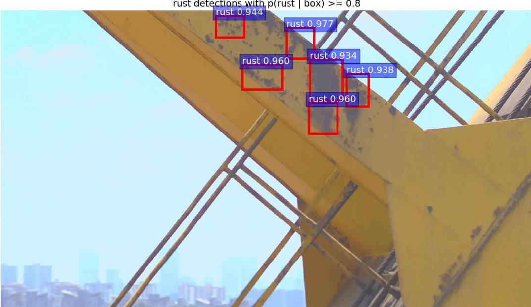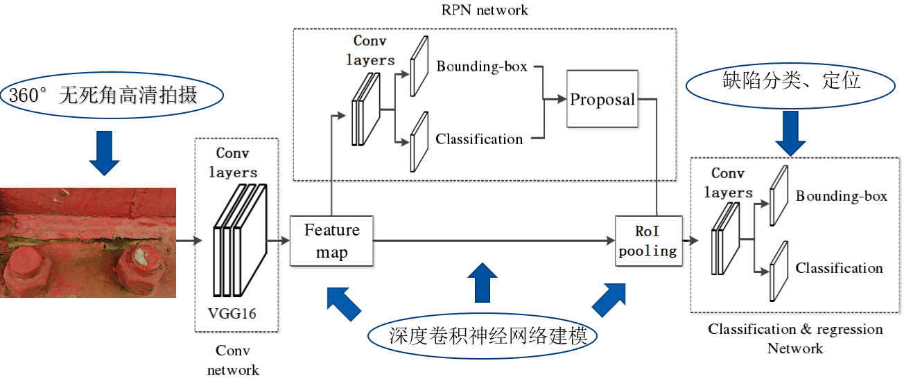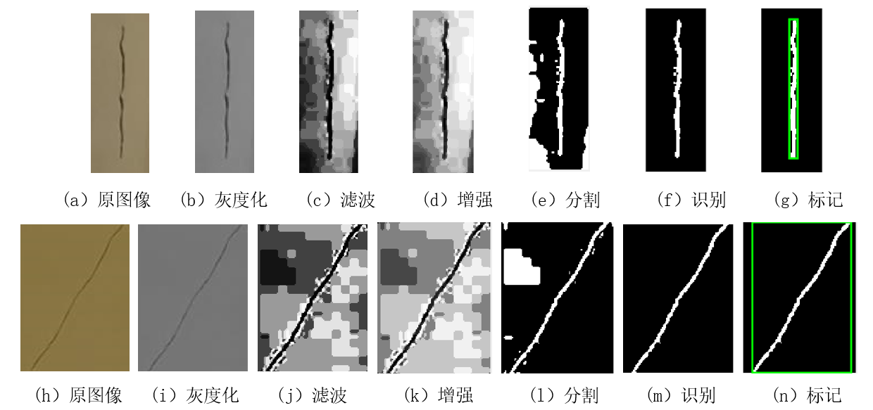 采用基于Faster R-CCN深度神经网络的缺陷检测识别算法,通过分类和回归来实现裂纹、锈蚀等缺陷的分类和检测;利用裂纹特征参数识别算法,对金属结构表面裂纹宽度、长度、面积、裂纹类型及其走向等相关参数进行定性及定量分析;利用像素点法统计得到腐蚀区域面积计算腐蚀率,为金属结构安全评估提供精确有效的数据基础。