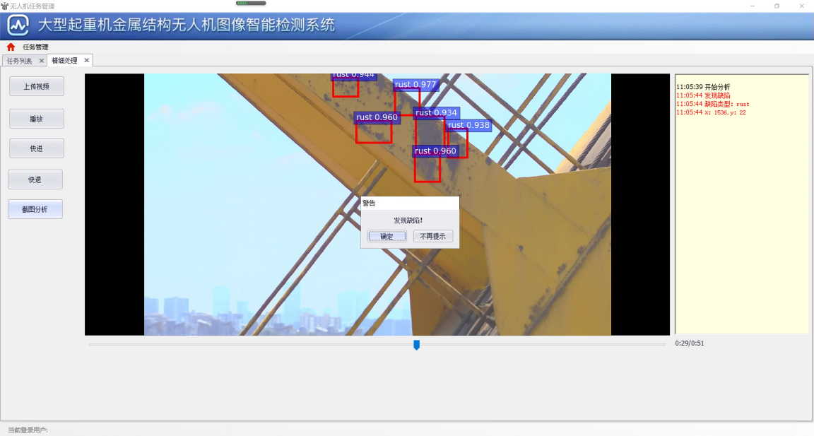 无人机图像智能检测系统软件采用BS+CS结合架构,解决缺陷检测、识别、报警、标记等问题,根据现场采集的图像,调用深度学习算法进行自动检测并出具初步报告;实现设备基础信息导入、更新,报告审核、批准和统计分析功能,通过人工复查图像缺陷并进行标记,对报告进行修改、审核。